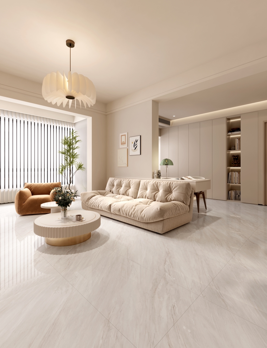 以淡雅米白色為基調,交織淺褐色紋理,如珊瑚暈染,又如玉石脈絡,盡顯優雅質感,鋪貼后為空間增添一份高雅格調,營造出舒適且具有品味的家居氛圍。